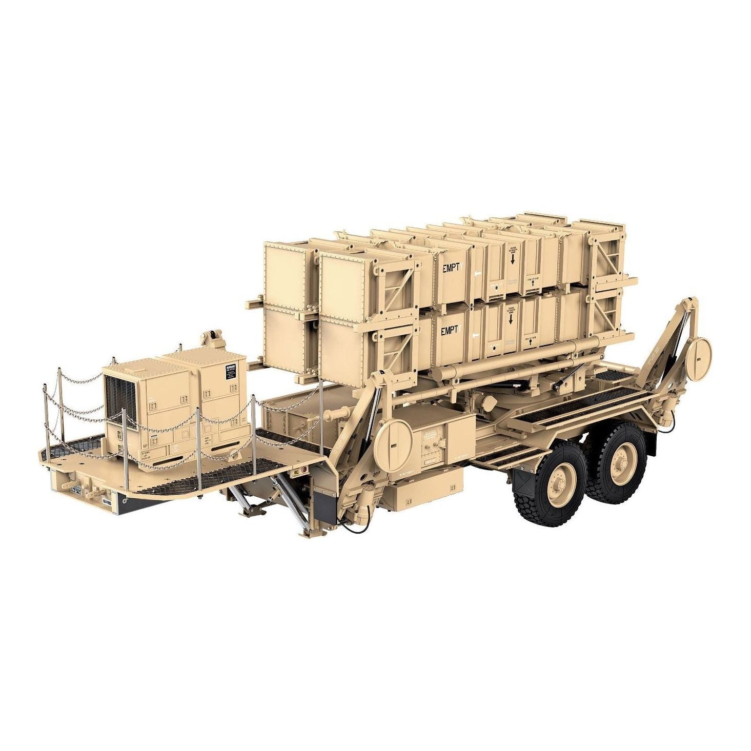 This beautiful scale replica of a mobile missile launcher of the U.S. Army in 1:12 scale convinces with its pure size, equipment, and electrical functions. The trailer is compatible with our 1:12 scale HEMMT 8x8 Trucks. Together, they make a considerable team with a length of over 63 inches. The trailer alone is just under 28in in length, with a robust frame made of metal alloy- weighing around 22lbs.
