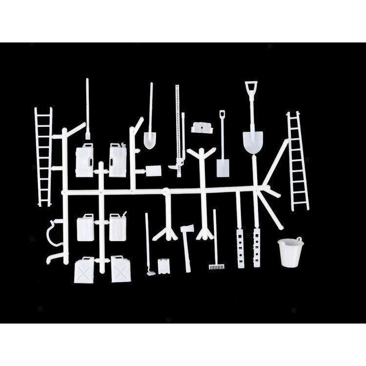 A 1/16 scale tool kit to go with the 1/16th scale tanks and trucks. Comes with an assortment of unpainted accessories.